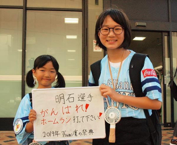 お母さん同伴のもと、福岡県行橋市から応援に駆け付けた。「多いときは毎月3回ドームに来ます」と家族ぐるみのホークスファン。お姉ちゃんの注目選手は明石選手、お母さんは柳田選手のファンで復帰を強く願っており、今日の注目選手は周東選手や栗原選手などの若鷹たち。
