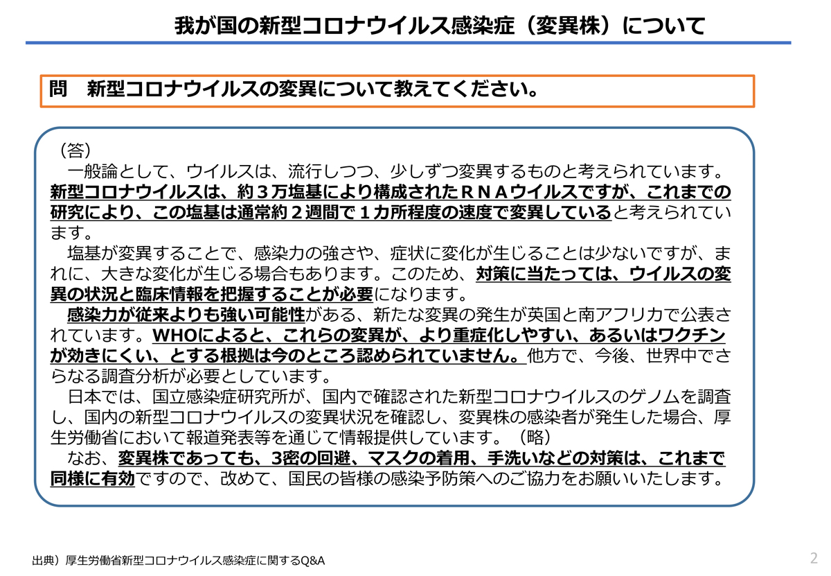 新型コロナウイルスの変異株は、国内で135事例が確認されている(2月23日時点)。新型コロナウイルスの変異については下記の通り。