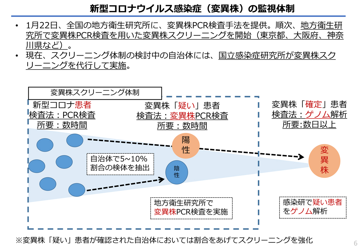 厚労省は1月22日、全国の地方衛生研究所に変異株PCR検査手法を提供し、順次、地方衛生研究所で変異株PCR検査を用いた変異株スクリーニングを開始していく。