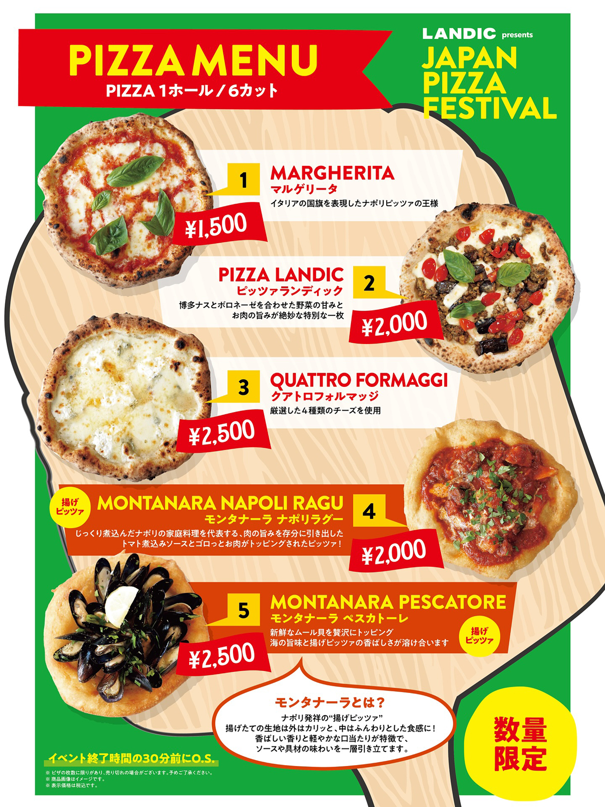 このイベントは、日本各地から腕利きのピッツァ職人を招き、イタリアから取り寄せた本格素材とイタリア製薪窯で焼き上げるナポリピッツァを中心に、揚げピッツァ(モンタナーラ)など多彩なメニューをそろえる。 また、福岡の評判高いイタリアン料理店も出店し、前菜、パスタ、スイーツ、ワイン・ビールなども楽しめる構成となっている。