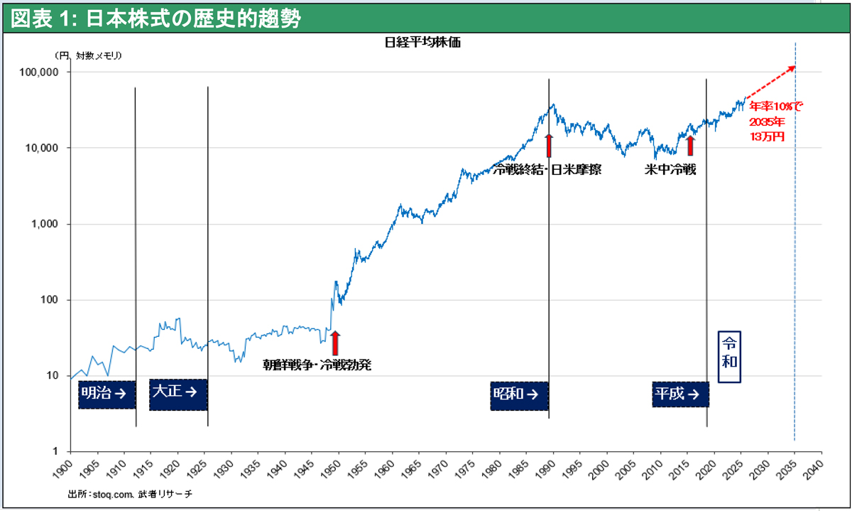 武者 まず日本株式の長期上昇トレンドに弾みがつく可能性が高いと考える。2012年12月の第二次安倍政権の成立により日本株式は長期上昇トレンドに入った。直近までの日経平均は起点をどこにとるかによるが、年率10~13%成長である。この趨勢が続くと考えれば、10万円には2031年か遅くとも2033年に到達、2035年には12万から16万円に達すると計算される。