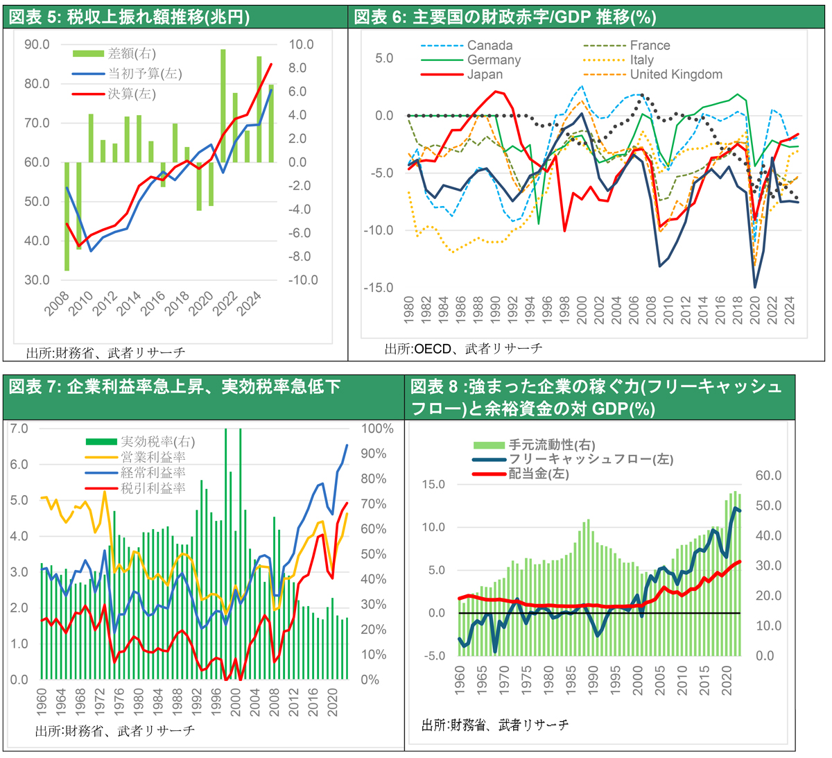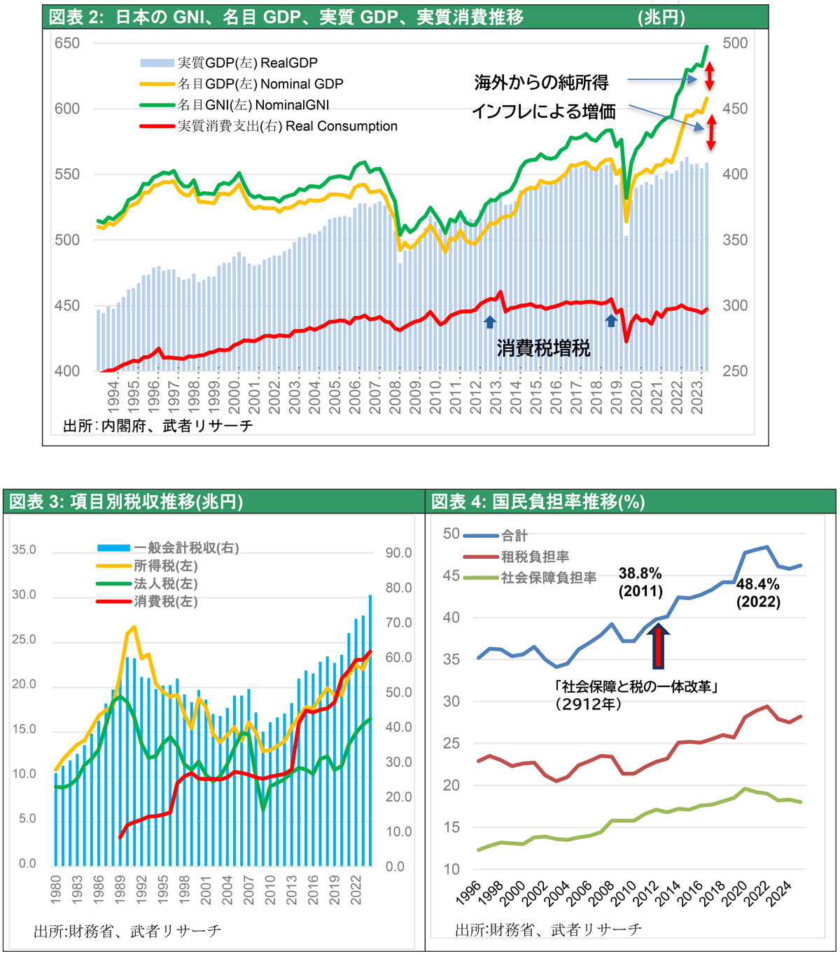 武者 アベノミクスが道半ばで目的成就できていないのは、ひとえに政策の誤りにある。目的未達とは企業の稼ぐ力が完全復活し、株価は4倍になり、税収も大幅増収が続いているのに、個人の生活水準は、長期低迷を余儀なくされていることである。実質家計消費は10年前のピーク比マイナス状態が続いている。原因は税の取りすぎにある。「税と社会保障の一体改革」の美名のもとで、国民負担率は2011年の38%から2022年の48%まで乱暴なほどに押し上げられた。ようやく実現した賃金上昇もインフレに追いついていない状況の下で、税負担増が消費を直撃している。他方インフレにより税収は恒常的に大幅に上振れを続け、日本の財政赤字(対GDP比)は2025年1.8%(OECD推計)とG7で最良となっている。他方税負担増による消費圧迫が最大の原因となり、日本のGDP成長率はG7で最低まで押し下げられている。IMF経済見通しは2024年は米の2.8%、ユーロ圏の0.9%に対して日本は0.2%、2025年は米国の1.9%、ユーロ圏の1.0%に対して日本は0.7%となっている。