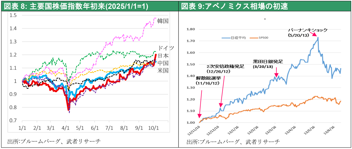 第二に市場の支持がある。財政健全化路線は、決定的に重要な市場も支持しない。過去政権誕生時の株価の反応は二つに分かれる。金融所得課税を打ち出した岸田氏、財政健全化路線を主張していた石破氏の政権発足時、株式市場は大幅下落で反応し、厳しい財政スタンスの緩和を余儀なくされた。それに対して第二次安倍政権発足時には、日経平均は半年で73%という急騰を見せ、安倍氏の政策(アベノミクス)遂行を後押しした。株式市場の支援がなければアベノミクスは頓挫していただろう。今年の各国相場にも政策への評価が現れている。韓国相場の急騰、年初来47%、李在明政権成立(6/4)以降28%上昇、ドイツも積極財政に転換したメルツ政権成立(5/8)により好調である。