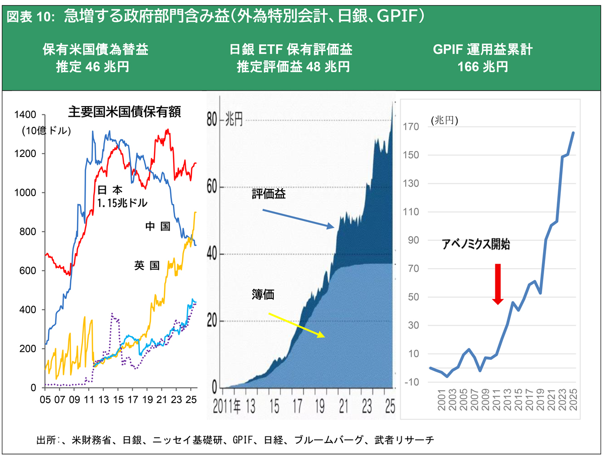 これらは全てアベノミクスによる成果であり、高市氏の政策推進の原資に充当できる。このうち外為特会の為替益、日銀保有の含み益は、防衛・国土強靭化・研究技術開発などに何にでも使える。GPIFの累積運用益も年金改革(大幅な給付の引き上げ)に利用可能であり国民福利に還元できる。アベノミクスは円安株高以外何ももたらさなかったと批判派が投げつけてきた非難が、いかに的外れであったかがわかるだろう。