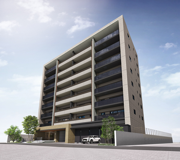 建物外観はシンメトリーな垂直ラインが印象的な端正なフォルムで、上品な色調の外壁が特徴。タイル敷きのエントランスアプローチには、シンボルツリーが配される。建築物の概要はRC造・地上8階建、延床面積2,650.03m2の全28戸。ルームサイズは家族の生活スタイルに合わせ、3LDK(21戸)と4LDK(7戸)を用意。駐車場は平置き15台を含む全29台を確保し、宅配ボックスやペット足洗い場など共用設備も充実。さらに、一次エネルギー消費量を削減するZEH-M Oriented(ゼッチ・マンション・オリエンテッド)認定も受けている。