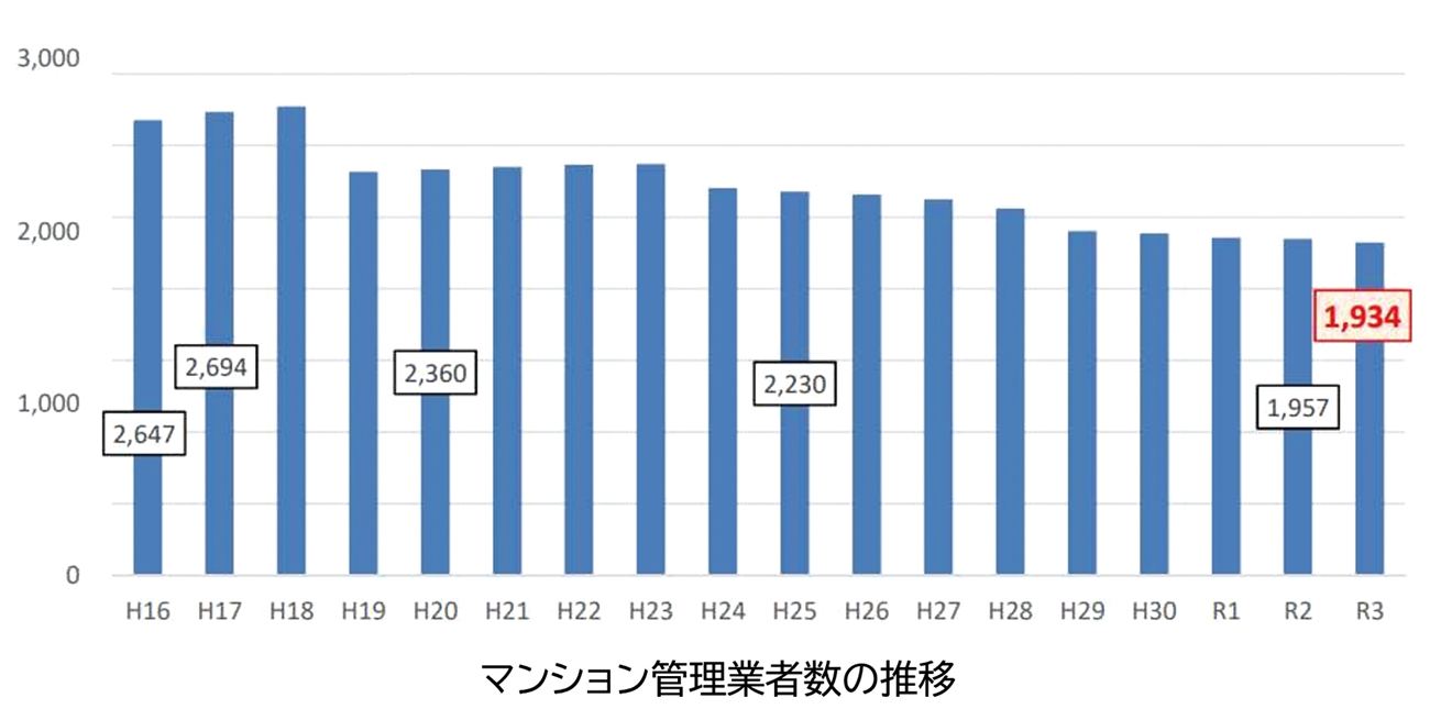 うぇるねすがマンション管理会社に対して23年8月に実施したアンケートによれば、管理員採用時の課題として「求めている人数の採用ができない」【表③】という回答が多く寄せられており、管理者が不足している状況が浮き彫りになっている。【表②】は国土交通省がまとめた「不動産管理業の未来」と題する資料から抜粋したものだが、マンション管理業者数も減少傾向にある。