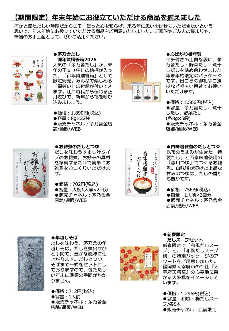 同社はこのほか、年末年始の需要に向けて贈答用・家庭用の期間限定商品を幅広く展開する。26年干支デザインを用いた「茅乃舎だし 御年賀贈答箱2026」や、太宰府天満宮の太鼓橋をイメージした意匠による「新春限定 だしスープセット」など、多彩なラインアップで新春需要に応えている。