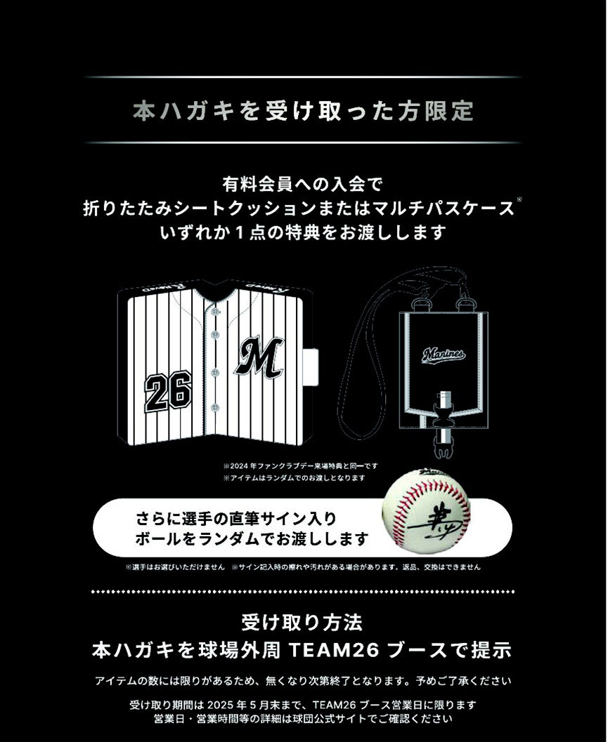 対象となったのは、「千葉ロッテマリーンズ公式ファンクラブ TEAM26」の2025年度会員向けサービス。同社は25年1月17日付で郵送したダイレクトメールにおいて、有料会員に入会し、球場外周に設置されたファンクラブブースで当該はがきを提示すれば、選手の直筆サイン入りボールが提供されるかのような表示を行っていた。しかし、実際には直筆サイン入りボールが提供されるのは入会者の一部に限られていた。