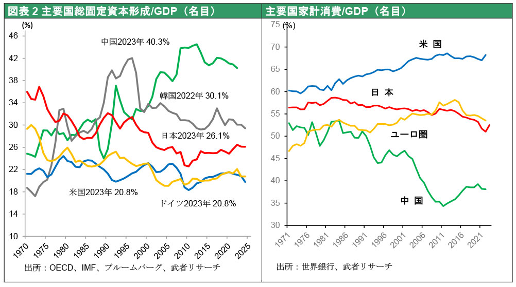 他方不動産バブルの崩壊とデフレ化、失業率の高まりにより将来不安が募り、家計は一層貯蓄に励む。中国の貯蓄率は総貯蓄率で43%(2024年)、家計貯蓄率で36%(2023年)と他国に比べて突出して高い。過少消費→過剰貯蓄→過剰投資、のサイクルがもたらす巨大な過剰工業力は中国の歪んだ経済構造の賜物である。世銀の調査による主要国の家計消費のGDPに対する割合を見ると、中国は38~39%で推移している。一方、中国の固定資本形成はGDPに対して40%強であり、投資よりも消費のほうが小さいと言う他に例のない異常な経済構造が長期にわたって続いている(図表2参照)。