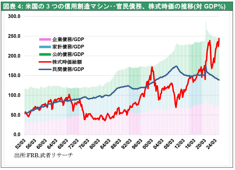 資本主義の母国は米国である。英国は資本主義を作ったが、完成させることはできず、途中で米国やドイツに敗れ、英国産業は衰退した。海外での金融と海運で所得を稼いだが、国内投資はおろそかにされ、内需が育たなかった。米国は英国のような道を歩まなかった。国内需要を創造し、それが新たな産業の受け皿になった。国内の需要を作ったのは、米国の資本主義の最も重要な推進力である信用創造である。1.金本位制をやめ、2.財政拡大を行い、3.海外に対してドル供給を行い、それらの債務増加の全てを需要創造に振り向けてきた。米国政府のこうした需要創造(=成長至上主義)を正当化する根拠はただひとつ、国民の生活水準の向上である。この1点に米国の国益がかかっており、トランプ氏も常にそれを考えている。国民の生活水準が上がるかどうかで評価されるのが米国の民主主義である(図表4参照)。