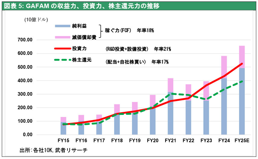 このGAFAMやNVIDIA、オラクル、オープンAI、ソフトバンクなどのプレーヤーは経済金融のプラットフォームとしての株式資本主義に立脚している。まず図表5によりGAFAM5社を見ると、これまで利益の9割を自社株買いと配当によって株主に還元しきた。無駄な資本を貯めこまないためROEはおおむね60%前後の高水準で推移している。それにもかかわらず投資は自己資金(FCF)の範囲内であり、借入金はごく少なく自己資本比率は6~7割と高い。GAFAMが実現しているモデルは、利益の全てを株主に還元し、高株価により高い資金力を獲得し、高投資を続けることで高い利益成長を実現するという好循環である。