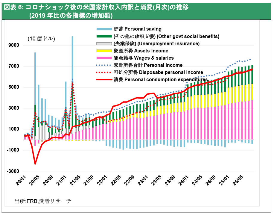 当面データセンター投資などAI設備の初期投資が急増し、経済を押し上げている。またGAFAMなどのハイテク企業はAIを活用した新サービスを立ち上げ、利益成長を加速させている。しかしAIは市場調査、書類作成、グラフィックデザイン、プログラミング等ホワイトカラーの職を奪い労働需給の悪化も引き起こしている。増加する企業利益を如何に家計所得と消費増加につなげるのか、手立てが必要である。図表6はコロナショック後の月次家計収入と消費の増加趨勢(年率換算)を見たものだが、賃金は家計所得増加の半分に過ぎず、残りが配当・金利等の資産所得と財政支援によって賄われていることが分かる。この家計所得には資産売却益は含まれていないが、それを考慮すれば家計所得の株式関連所得依存度は2~3割を超えるだろう。家計が貯蓄を取り崩して消費を続けてきたのは膨大な資産価格上昇の評価益があったからこそである。このように余剰フローの主経路として株式市場が決定的な役割を果たしている。
