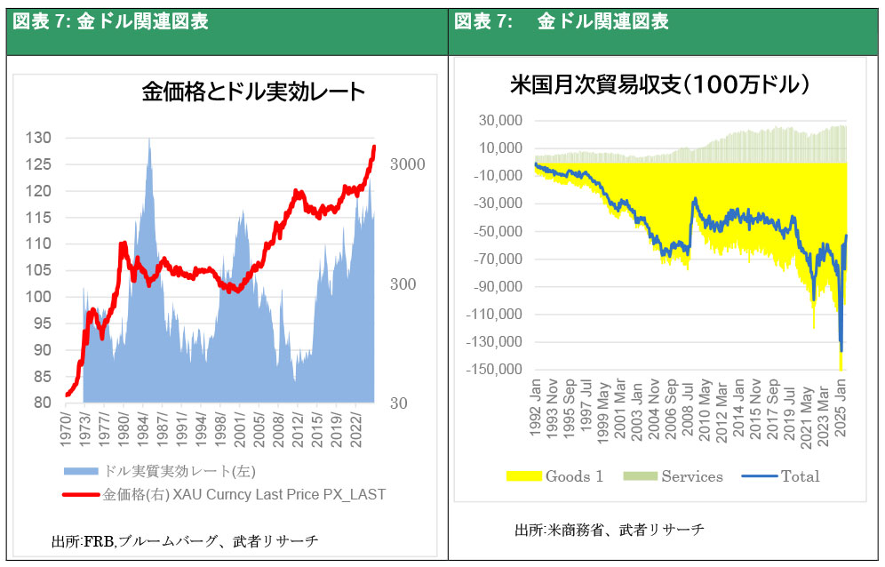 執拗に上昇を続ける金価格がドル不安の高まりの現れ、との懸念があるがそれは正しくない。過去を検証すると金とドルとの連動関係は、2002年から2011年のドル下落が金上昇と一致しているにすぎない。ドルは米国の貿易収支(対GDP)との相関が強いが、米国貿易赤字は関税導入以降大きく減少しており、それはドル高要因と言える(図表7参照)。では金価格上昇は何によってもたらされているのだろうか。ドル決済から締め出されたロシアや中国の金保有の増加が第一の要因であるが、それ以上にドル信用の供給量と連動していると考えられる。1980年の金高はニクソンショック(ドル金交換停止)による信用増大、2011年までの金高はグラススティーガル法廃止による信用増大と照応している。では今米国で増大が進行しそうな信用とは何か、それは仮想通貨かもしれない。