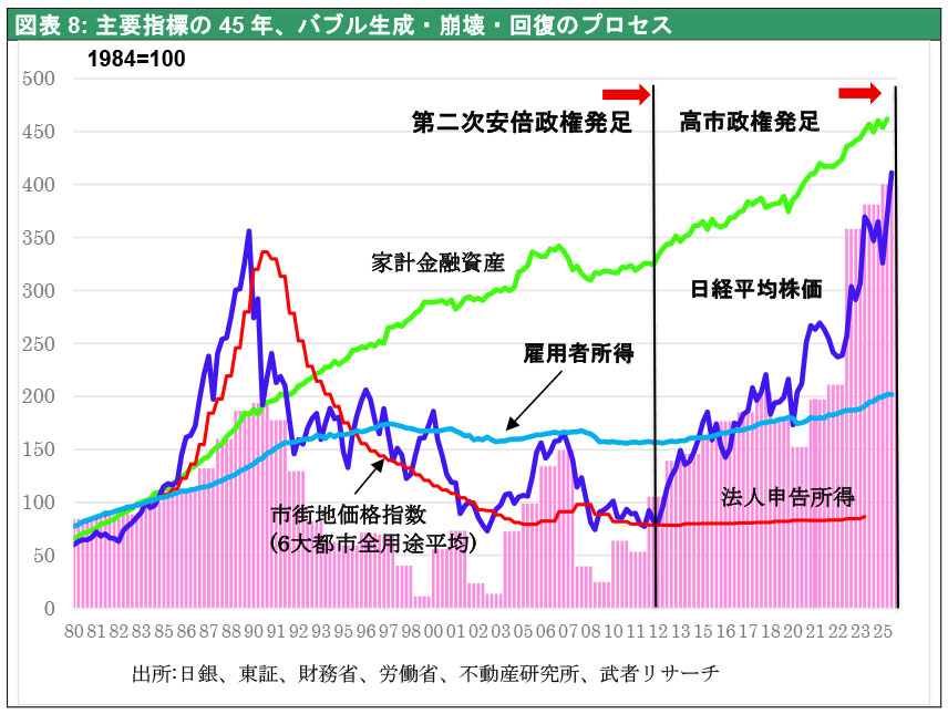 アベノミクスがスタートした直前の2012年と比較すると、株式時価総額は3.9倍(301→1,161兆円へ)、法人企業経常利益は2.4倍(48.5→114.8兆円へ)、一般会計税収は2倍(40.9→80兆円強へ)、GPIF運用益は6.6倍(25→166兆円へ)、外国人観光客4.8倍(835→4,000万人へ)と目覚ましい上昇を見せた。名目GDPは1.24倍、就業者数は1.09倍、女性就業率61%から85%へ、最低賃金は759円から1,021円へ、と大きく改善した。デフレが終わり0%であった政策金利は0.75%まで引き上げられた。85円であったドル円レートは156円に上昇した(図表8参照)。