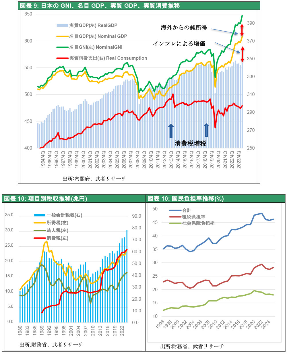 但し国民生活は失われた30年のままである。実質家計消費は2012年度末302兆円、2013年度末311兆円に対して2025年3Q298兆円(2020年基準)と、むしろ低下している。経済成長率もG7の中でも最低水準が続いている。デフレ経済下で強行された「社会保障と税の一体改革」により国民負担率が、2011年度の38.8%が2022年度48.4%、2024年度(推)46.2%と急上昇したためである。しかしこれから高市政権の高圧経済政策による減税が打ち出され、実質消費も回復し始めるだろう。国内投資も上向き、消費と投資の拡大好循環が起きることはほぼ確かである(図表9,10参照)。