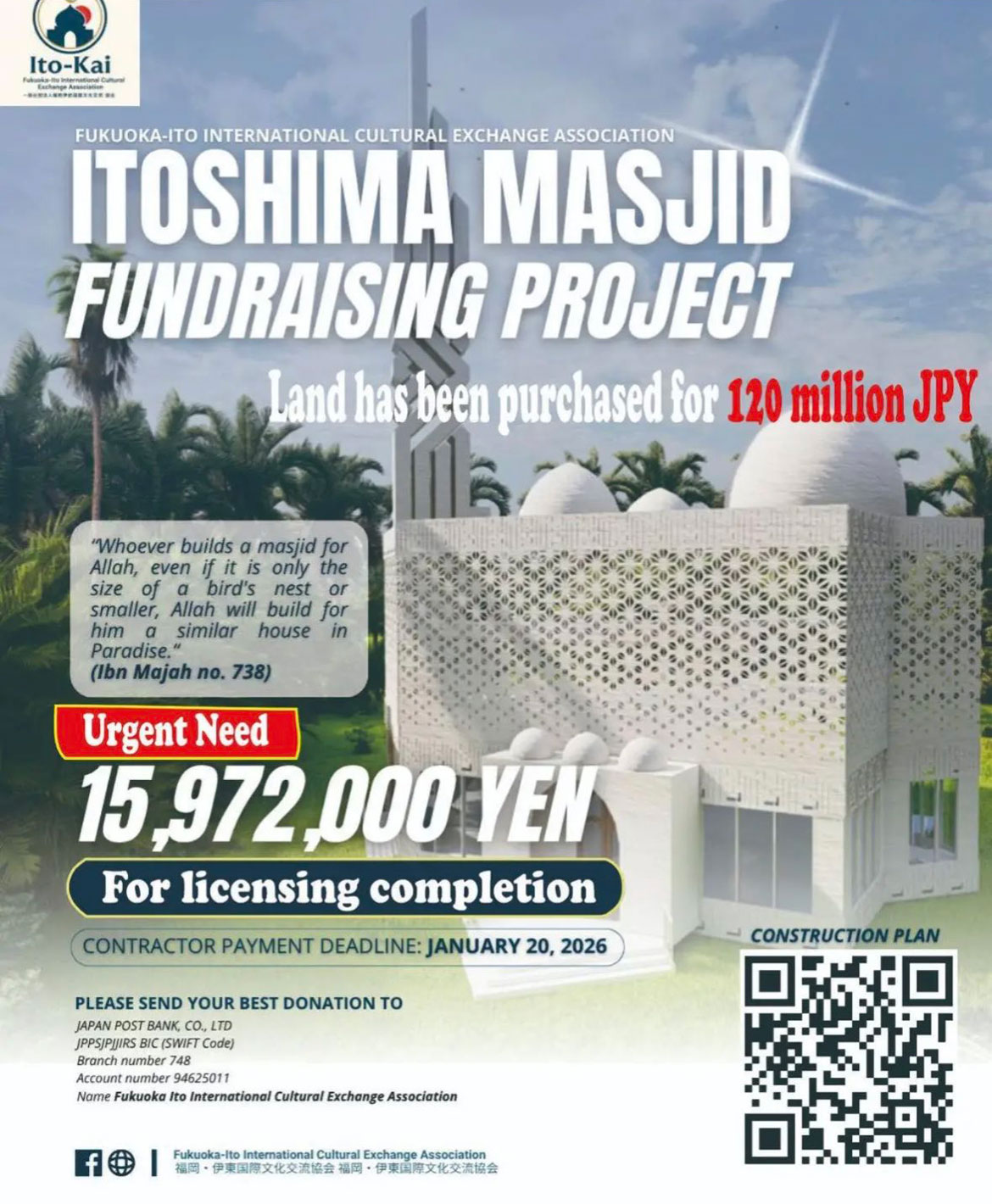 糸島市で進むモスク(イスラム教の礼拝堂)建設計画がSNS上で話題となっている。計画主体は(一社)福岡伊都国際文化交流協会。SNS上で公開されている寄付を募る画像の文言によれば、1億2,000万円で土地は購入済ながら、許可を得るために1,597万2,000円が必要だという。期日は1月20日まで。