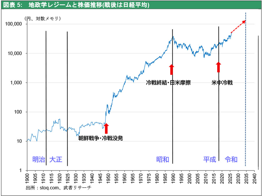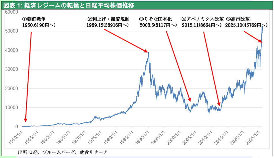 図表1に見るように、日本の株式市場の転換とトレンドは全て地政学的枠組みと政策選択に支配されてきた。戦後の画期は、(1)1950年6月の朝鮮戦争の勃発(日経平均90円から)、(2)1989年12月末のピークアウトは米国の日本たたきとバブルつぶしの金融引き締め(日経平均1万8,916円から)、(3)2003年5月の大底はりそな銀行部分国有化・金融不良債権処理完了(日経平均8,117円から)、(4)2012年11月14日の大底は解散総選挙から始まるアベノミクス変革の開始(日経平均8,664円から)、の4回あったが、今回の高市政権の成立は、戦後5番目の大変革を画する長期トレンド形成になると考えられる。起点は2025年10月4日の高市氏自民党総裁就任である。