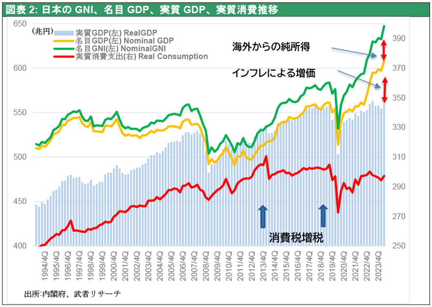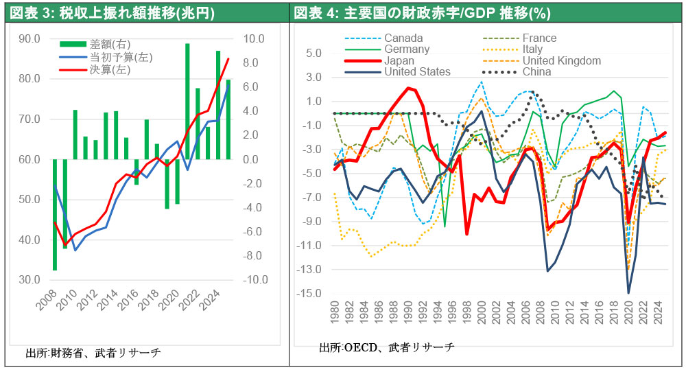 第二に財政健全化のお題目の下で、国民生活が著しく犠牲にされてきた現実がある。1990年にバブルが崩壊してもなお増加し続けてきた実質家計消費は、2014年1Qをピークに下降に転じた。2012年度末302兆円、2013年度末311兆円に対して2025年3Q298兆円(2020年基準)と、低迷から脱しておらず、現役世代の怒りが高まっている。経済成長率もG7の中でも最低水準が続いている。デフレ経済下で強行された「社会保障と税の一体改革」により国民負担率が、2011年度の38.8%が2022年度48.4%、2024年度(推)46.2%と急上昇したためである。(図表2)