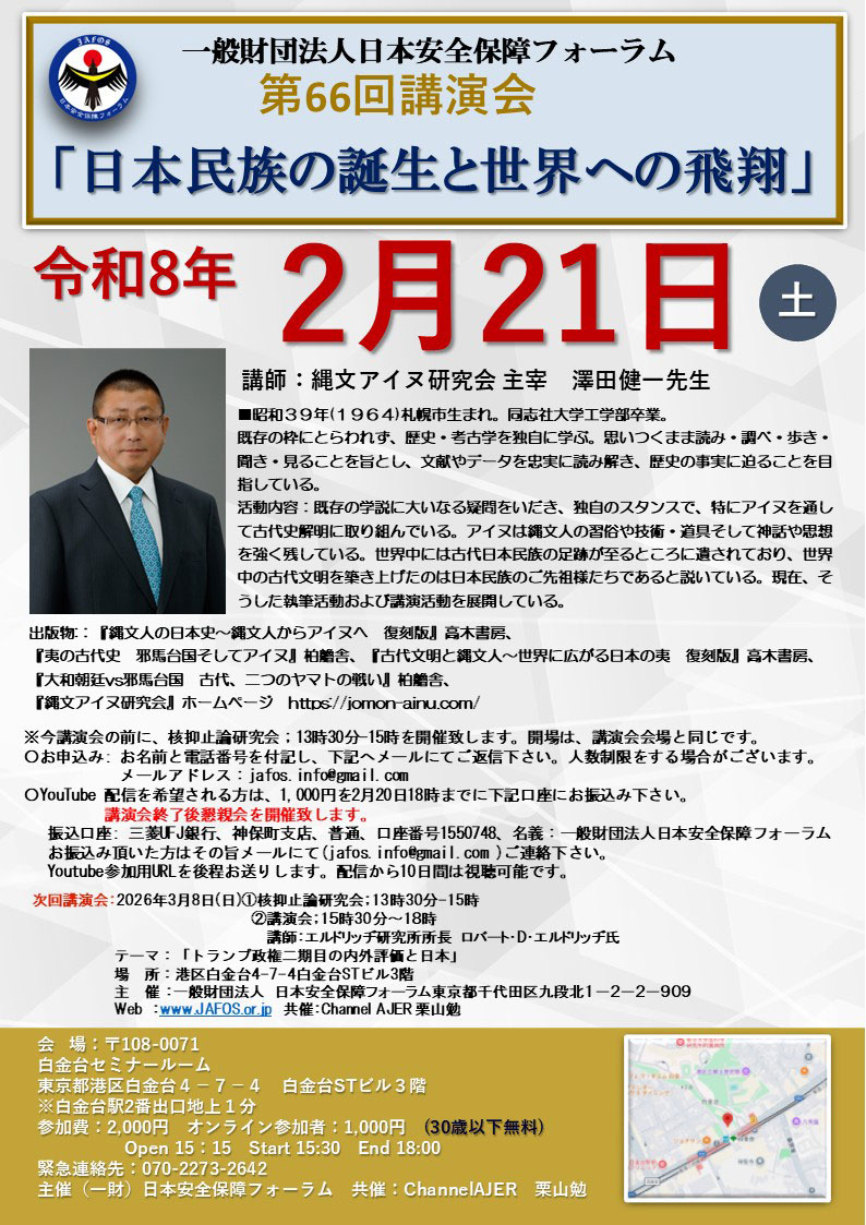 来る2月21日、港区白金台の白金台セミナールームで、(一財)日本安全保障フォーラムによる第66回講演会「日本民族の誕生と世界への飛翔」が開催される。