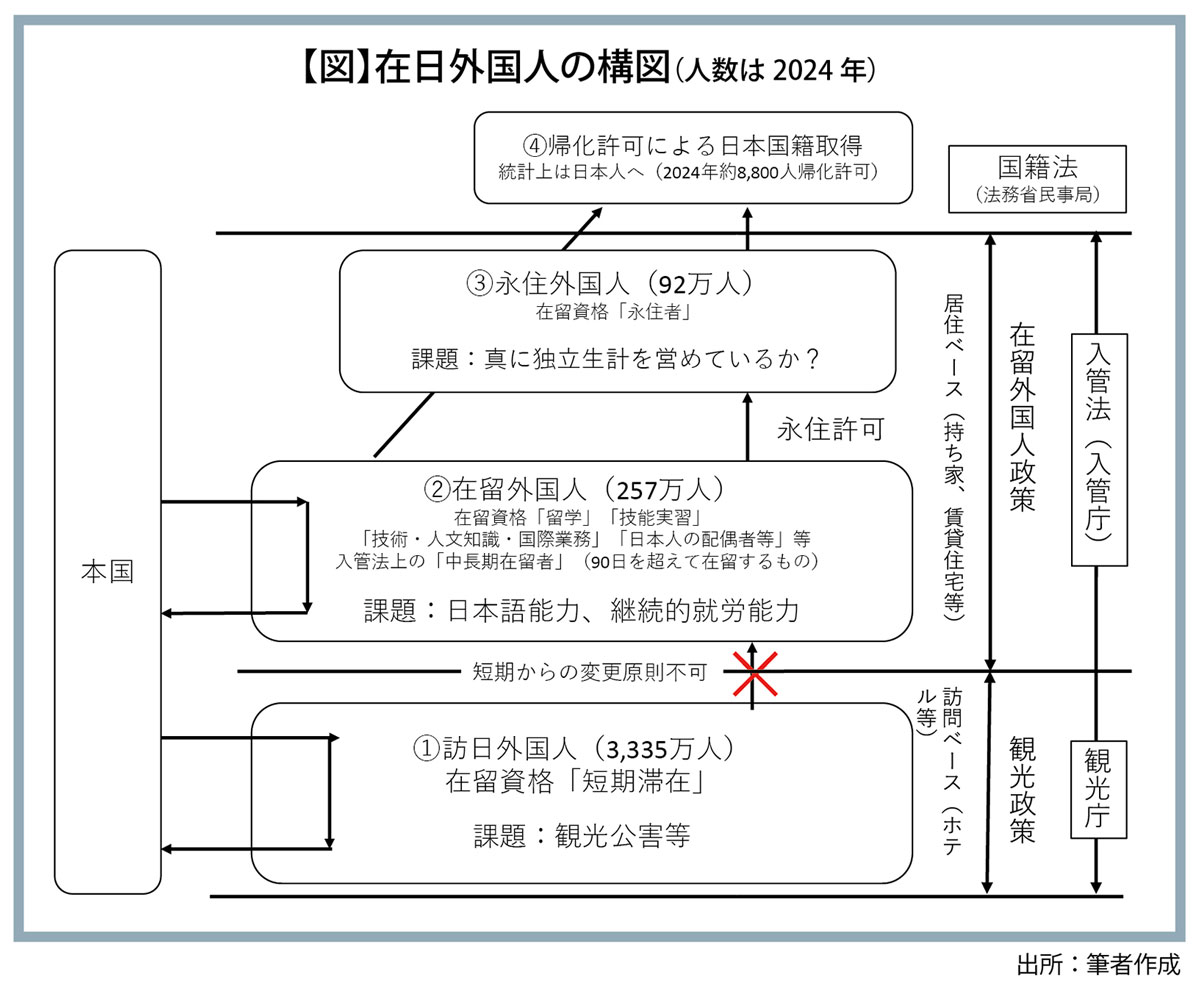 入管法の観点からすると①訪日外国人(いわゆる「インバウンド」や親族訪問者などで最大90日以内の在留)、②在留外国人(留学生や技能実習生など、生活・就労ベースの在留で、在留期間は年単位におよぶ場合もある)、③永住外国人(在留外国人が永住許可を申請し、永住許可を得た外国人。例外的な場合を除き「死ぬまで」在留できる)、④在留外国人や永住外国人が帰化によって日本国籍を取得し、統計上日本人になった者(ゆえに入管法による在留管理の対象ではなくなる)、⑤不法滞在外国人(図にはないが、①~③のいずれにも該当せず、在留資格無しで在留している外国人で「強制送還」の対象である)。