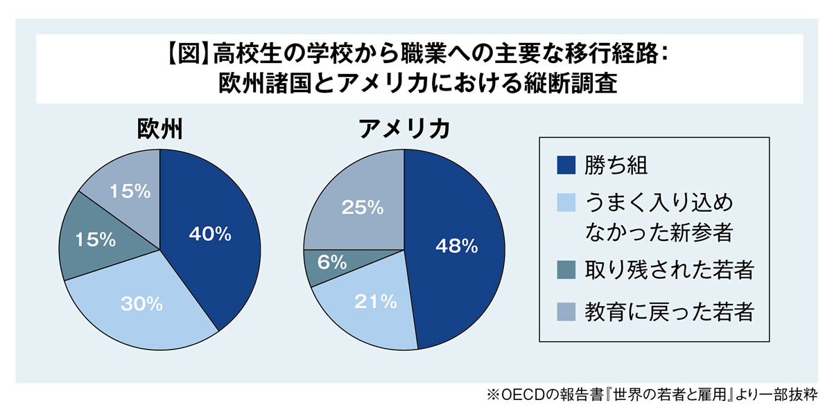先に挙げたOECDの報告書『世界の若者と雇用』に、大変印象的なグラフが載っている。学校から職業への移行がうまくいったかどうかで、若者を「勝ち組」「うまく入り込めなかった新参者」「取り残された若者」「教育に戻った若者」の4つに分けている。さて、ここでいう「勝ち組」(high performer)の定義は何だとお考えになるだろうか?