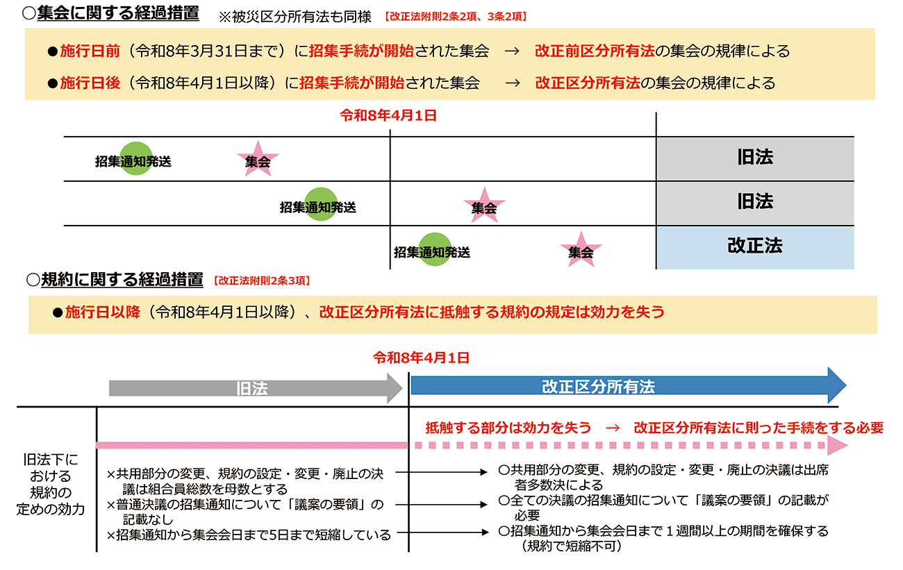 区分所有法・被災区分所有法の改正内容が反映されるのは4月1日からだが、経過措置が設けられている。経過措置として、集会の招集通知発送日が3月31日までであれば、これまで通りで改正前の制度が適用される。招集通知日が4月1日以降であれば、新しい制度が適用される。すなわち、3月31日以前に招集通知を発送すれば、集会が4月1日以降でもこれまでの制度が適用される。
