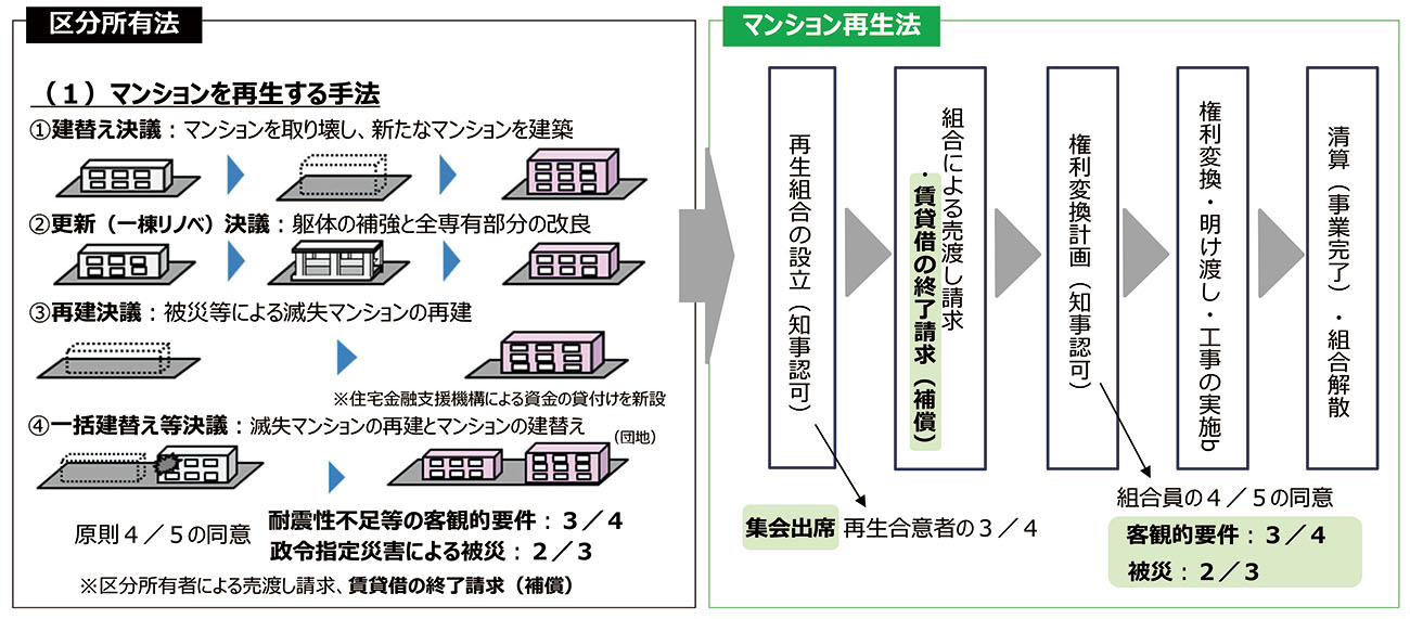 マンション建替えなどの再生の円滑化では、建替え決議の要件を緩和する。耐震性の不足など一定の客観的事由を満たす場合に、多数決の割合を原則の5分の4から4分の3に引き下げる。また、建替え決議が成立した場合に、金銭補償を条件に賃貸借などを請求から6カ月経過で賃貸借を終了して明け渡す制度を創設した。