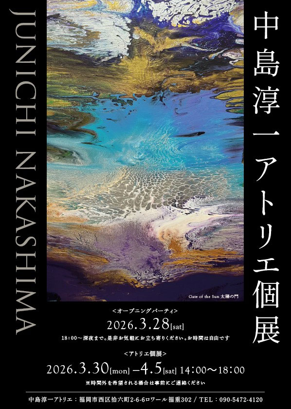 画家・詩人として活動する中島淳一のアトリエ個展が、3月30日~4月4日まで福岡市西区の中島淳一アトリエで開催される。作品を制作するアトリエ空間を公開する形式の個展で、抽象絵画を中心とした作品を鑑賞できる。