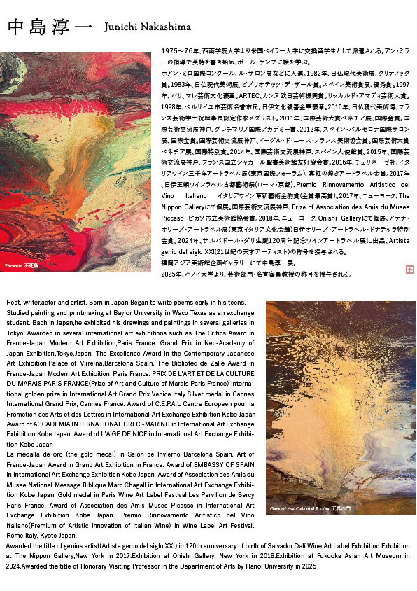中島氏は1975~76年に西南学院大学在学中、米ベイラー大学に交換留学生として渡米し、本格的に創作活動を開始。帰国後は国内外で個展や国際展に参加し、フランス、スペイン、イタリアなどの国際美術展で受賞を重ねてきた。絵画のほか詩作や舞台活動なども行うなど、ジャンルを横断した表現活動を続けている。