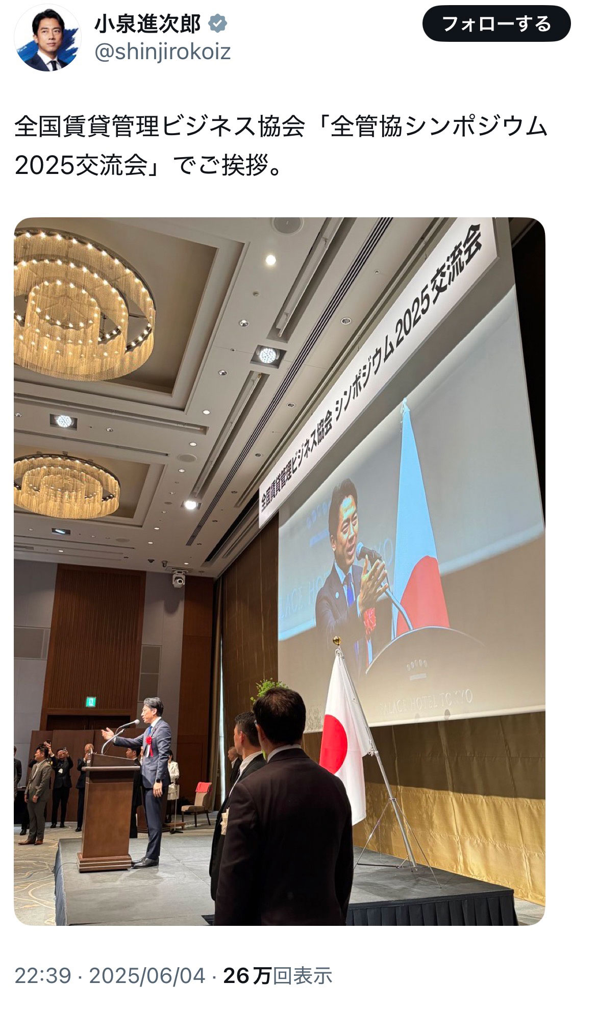 2025年6月4日、東京・丸の内のパレスホテルで全管協の定期総会・シンポジウムが開催されたが、Xの写真は総会後に行われた交流会に小泉氏が来賓として出席し挨拶したものだ。小泉氏の他、ちんたい議連会長を務める石破首相(当時)や菅義偉元首相らも出席している。