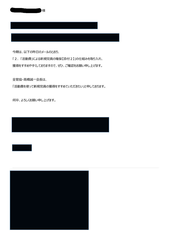 また、「活動費を活用し、新規党員を大幅に増やしている支部がございます。」と地方支部での状況を紹介した上で、「全管協・高橋誠一会長は、『活動費を使って新規党員の獲得をすすめていただきたい』と申しております。」と高橋氏の意向を伝えている。