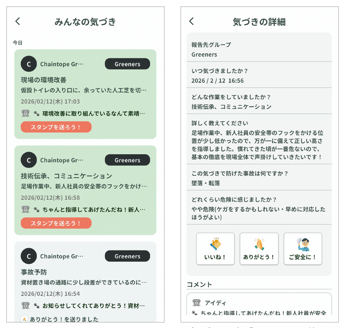 正田 私たちはもともと、船員向けに「気づき・ヒヤリハット」を収集・分析する仕組みを開発していました。海運業界には、他社の船が通った航路の危険情報を共有し、事故を未然に防ぐ「共有の文化」が根付いています。一方で、従来の建設現場における「ヒヤリハット報告」は事後報告になりがちで、現場の若手からは声が挙がりにくいという課題がありました。そこで中村社長の「日々のコミュニケーションが事故防止につながる」というお考えと、当社が海運業向けアプリで培った「小さな気づきをプラスの貢献として可視化する」というロジックが合致したのです。事故が起こる前の些細な気づきを気軽に共有できる仕組みをつくれば、安全確保と同時に、現場のモチベーションを変えられると考えました。