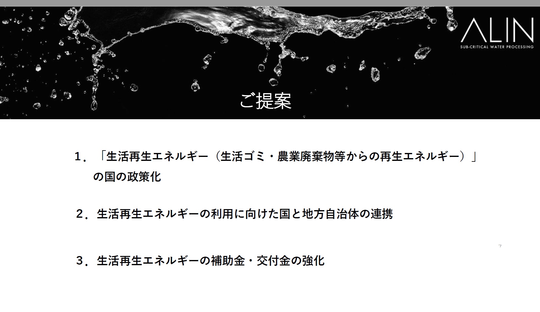 7ページには「ご提案」と題して、生活再生エネルギーの国の政策化や、国と地方自治体の連携、補助金・交付金の強化と記されている。