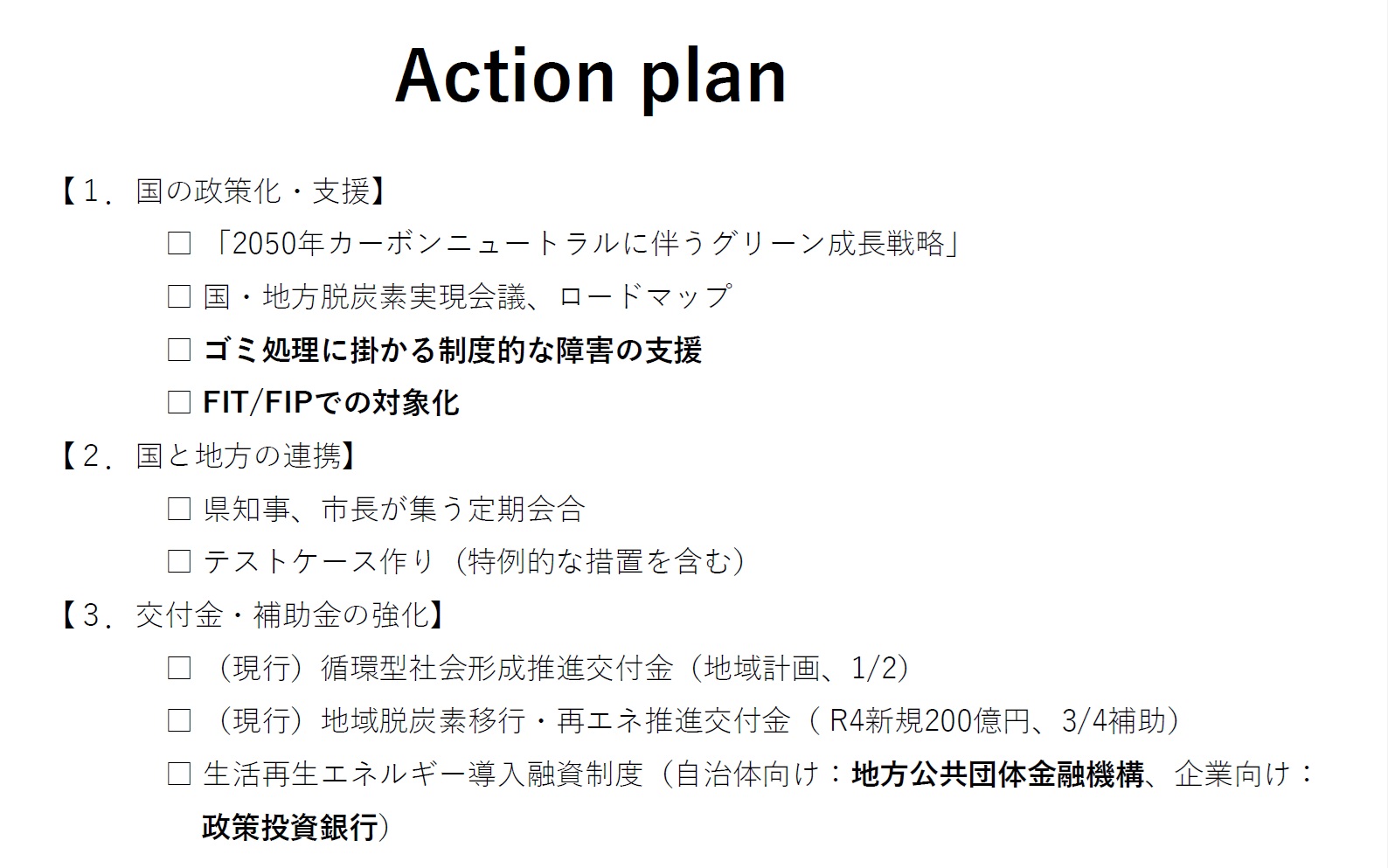 12ページには「Action plan」と題して同じく、国の政策化・支援、国と地方の連携、交付金・補助金の強化が示されている。これは、国と連携して動くことが重要と読み取れる。