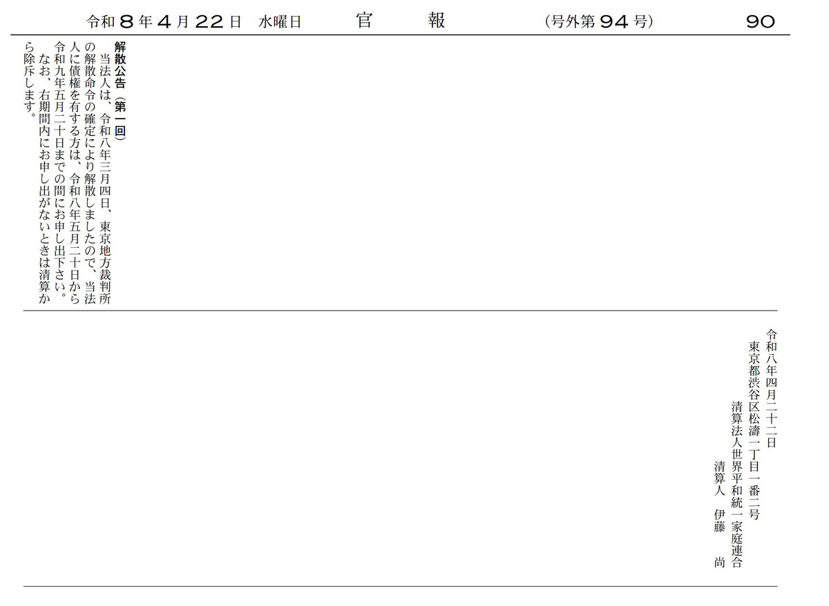 また22日付の官報(官報号外94号)で、高額献金被害などの申し出を5月20日から1年間受け付けることを公告した。