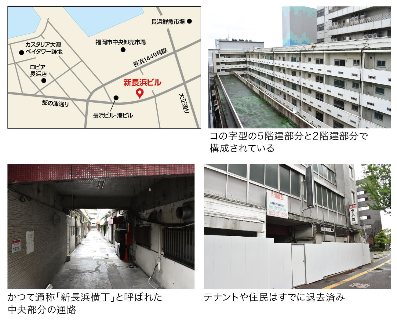 現在、新長浜ビルには仮囲いがなされ、入口などが閉鎖されている。具体的なスケジュールは不明だが、今後はビル解体が行われ、建替えによって新たなビルへと刷新されていくだろう。新長浜ビルの所在地は、福岡市の都市計画による用途地域では商業地域(建ぺい率80%/容積率400%(那の津通りから30mの範囲は建ぺい率80%/容積率500%))にあたる。また、福岡市地下鉄・赤坂駅から徒歩約10分とアクセスも悪くなく、前述したようにすぐ近くには長浜鮮魚市場などもある。こうした立地から、新長浜ビルと同様に1階部分が商業店舗で2階以上が住居系という線や、あるいは福岡市の都心部で開発が相次いでいるホテル等の宿泊施設といった線が考えられる。