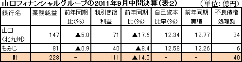 九州・山口の地銀(2011年9月)の中間決算から、グループの地銀の預貸金の計数及び収益、また各県内の他行との競争力を取り上げており、今回は山口フィナンシャルシティグループです。