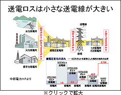 もちろん自然エネルギーを伸ばすのもいいのだが、意外な盲点があった。それが送電ロスだ。50万ボルトの高圧線を1とすると、家庭の近くを走る6,600ボルトの送電線は5,739倍も送電ロスする。太陽光発電を導入して、有効な社会資産をつくっているつもりでいても、実際にはほとんど近隣の家に電気需要がなければ送電ロスで消えてしまっている心配がある。しかも電力会社は固定買取制度で太陽光発電からの電気を買っているが、その費用はすべて他の家庭の電気料金から回収できるから電力会社の腹は痛まない。もしかしたら電力会社は「買っているふり」をしているだけかもしれない。