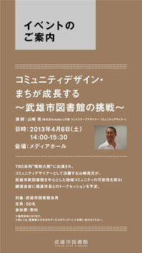 「コミュニティデザイン・まちが成長する〜武雄市図書館の挑戦〜」と題して、コミュニティデザイナーの山崎亮さん、最近は、テレビ東京「カンブリア宮殿」で特集されていましたが、4月6日(土)に武雄市図書館で講演をされます。