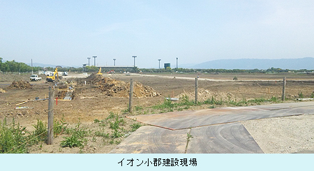 イオン九州(株)は、かねてから出店を計画し、2013年秋の開業を予定している「(仮称)小郡ショッピングセンター」の開発をスタートさせた。現在、出店予定地である福岡県小郡市大保の小郡市民球場横の農地では着々と造成工事が進められている。敷地面積は約11万8,000平方メートル。開業すれば福岡県中部に位置する三井・小郡地区では最大級の商業施設の誕生となる。