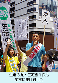 今回の選挙では、脱原発の点で一致する生活の党が支援についた。7日の新宿では、生活の党から比例代表に立候補している三宅雪子氏とともに新宿駅前を歩いた。三宅氏は、「山本さんは、子どもたちのことを考える無私の人。こういう人がいま、政治の場に必要なんです」と訴えた。