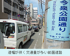 さらに、「園まで安全に通園できる歩行空間を確保することにした」とあるが、現時点における安全対策の内容を市担当部署(中央区)に確認したところ、前面道路が国体道路に交わる直前の幅4.6メートルと最も狭くなる部分については、電柱を移設するものの、「歩道を設置せず、路側カラーで対応」することが決定事項であるという。この4.6メートル部分は、前出の「ベビーカーを押しているときには...」と説明された箇所。この点、市長ブログでも画像によってはっきり示されている。路側カラーとは、路側帯を緑色に塗ることであり、断じて歩道になるということではない。司法関係者によると、万が一、この部分で事故が発生した場合、法律上は『車道上での事故』として扱われてしまうという。