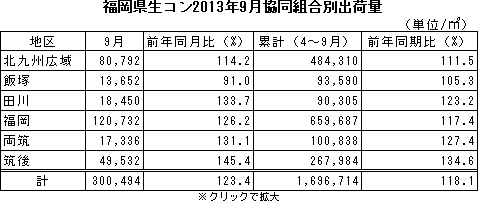 福岡県生コンクリート工業組合による、2013年9月の各協同組合別の出荷量は、別表通りである。