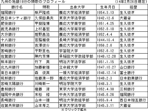 この人事によって、九州の地銀18行の頭取のうち、慶応大学出身者が6名、東京大学出身が3名で、この2つの大学で半数のポストを占めることになる。また、FFGの若返りに触発されて、他行でも今後、急ピッチで頭取交代が進むものと見られている。