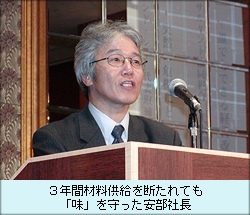 弊社と安部社長との繋がりのなかで、もっとも思い出深いのは、今から8年前、設立12周年記念セミナーで、延べ750名のお客様方へ深い感銘を与える講演をしていただいたことだ。当時、(株)吉野家はまだ前身である(株)吉野家ディー・アンド・シーの時代で、「狂牛病」という世界的な脅威を、独自の経営理念と社員との一致団結で闘い抜いた安部社長の経営手腕が、多くの経営者の関心の的となった。