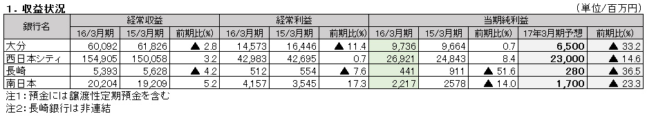 大分銀行が5月9日、九州地銀のトップを切って16年3月期の決算を発表。翌10日には、西日本シティ銀行と子会社の長崎銀行、南日本銀行の3行が発表した。
