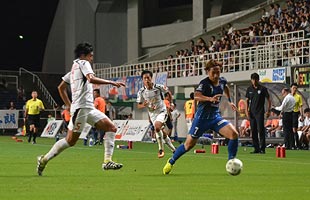 <サイドを上がる金森健志選手 | <ヘディングシュートを放つ城後寿選手 |
