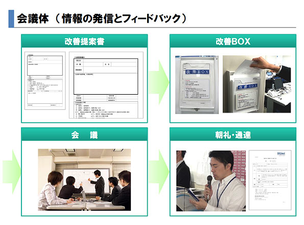 本部では、さらなる良い会社づくりのために「会議体」を重要視。どの会議で何が決定されるのか、目的と期限を明確にして行動計画を組み、決定事項は全社へ共有するのが目的だ。また、会社のいたるところに「改善BOX」を設置して業務限定社員や社員の意見を吸い上げている。