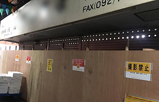 柳橋連合市場の高口ビルの建て替えをめぐり、立ち退きを強行する(株)ジョイフルコーポレーション(東京都町田市、佐野吉裕代表)のさらなる奇行が発覚した。10月28日朝、ジョイフル社が設置し、通路封鎖の原因となっている木製の衝立に、突如「撮影禁止」の貼り紙が掲出されていることが確認された。観光客もしばしば訪れる市場内での写真撮影は禁止という意味であろうか、ジョイフル社の目的は不明。市場内関係者も「ビルの所有者なので「立入禁止」はわかるが、撮影禁止と言われても、観光客は写真を撮りますからね」と困惑気味。