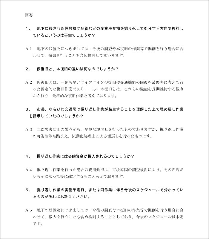 質問2は、「HUNTER」の取材に対する交通局の回答に疑問を持ち投げかけたもの。交通局は、賞賛を受けた陥没箇所の埋め戻し作業をライフライン・交通機能回復優先の「仮復旧」だとしている。陥没箇所が塞がったから本復旧というわけではないのだ。さらに質問3に対して、「掘り返し作業の可能性等も踏まえ、流動化処理土による埋戻しを行ったものです」と答えている。高島宗一郎市長は本復旧が完了していないと知りつつ「地盤の強度が30倍になった」と胸を張ったということだ。